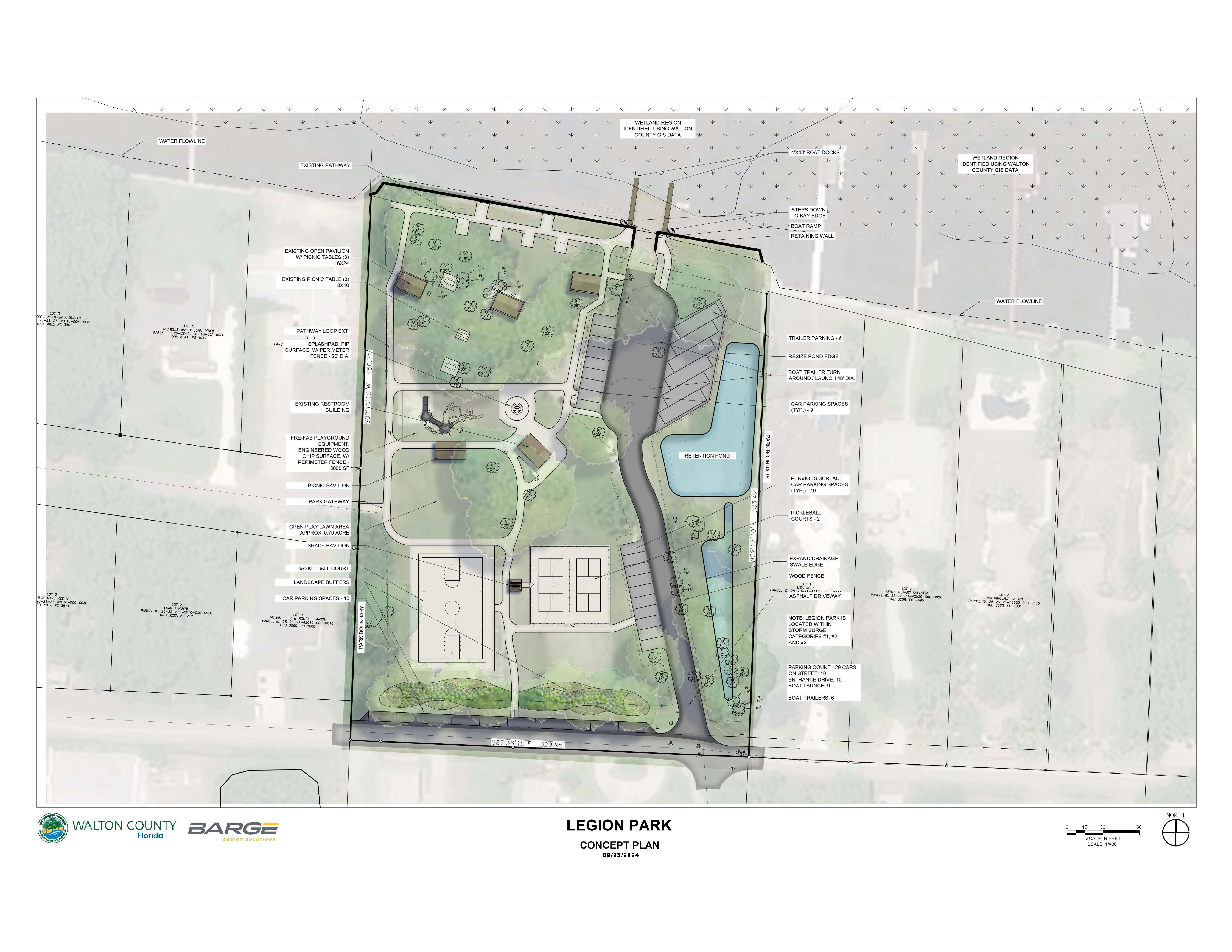 The Legion Park Improvement Project will bring several upgrades to this park located at 119 Crest Dr. Proposed improvements include a splash pad, new playground equipment, two launch piers, an additional pickleball court, resurfacing of the basketball court, construction of shade pavilions and additional parking for cars, trucks and trailers.
